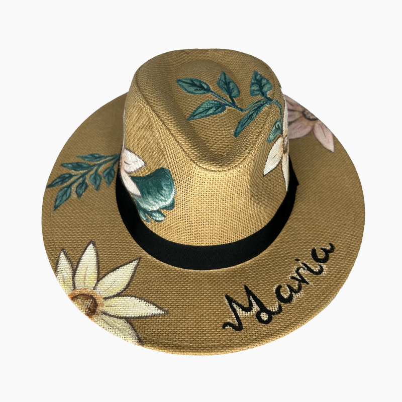 Χειροποίητο ψάθινο καφέ καπέλο με θέμα τα λουλούδια τύπου Panama ζωγραφισμένο στο χέρι.