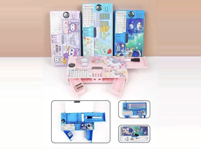Διαθέτει χώρο για μολύβια, χάρακες, γόμες και αξεσουάρ, καθώς και pop-up θήκες που ανοίγουν με κουμπιά. Το design ολοκληρώνεται με χαριτωμένα θέματα: διαστημικό, μονόκερος, δεινόσαυροι και λαγουδάκια!