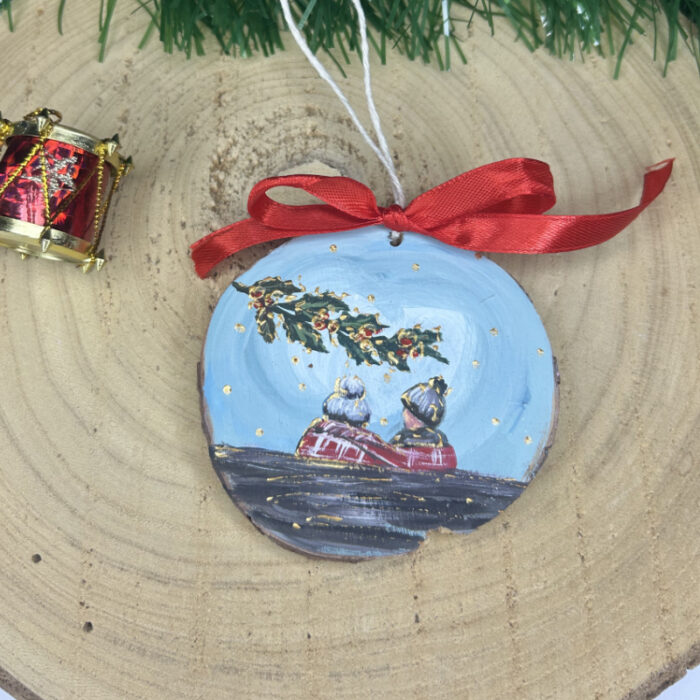 Το στολίδι είναι από φυσικό κορμό δέντρου και είναι ζωγραφισμένο στο χέρι με ακρυλικά χρώματα και διακοσμημένο με κορδόνι και κορδελάκια υψηλής ποιότητας