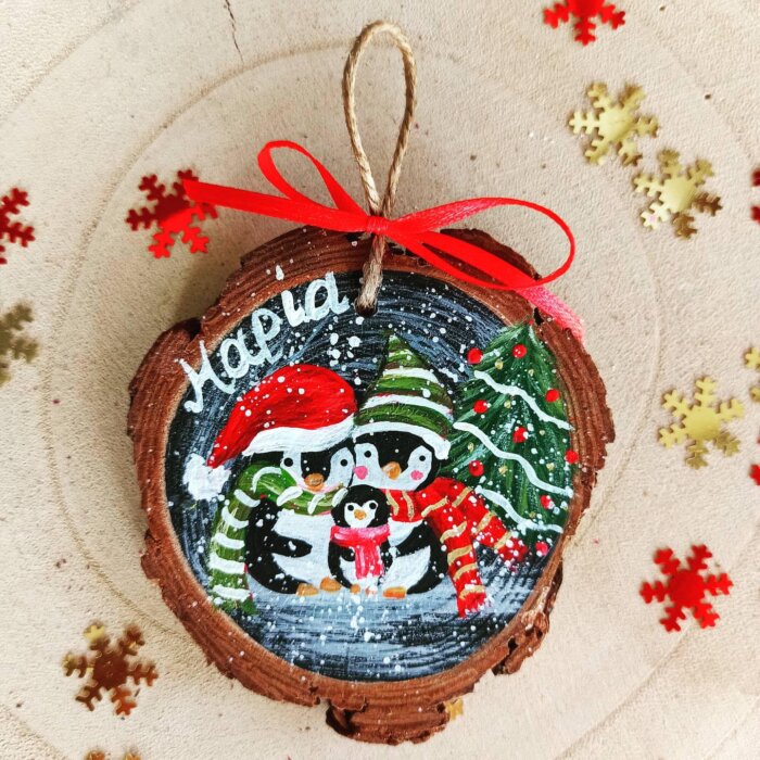 Το στολίδι είναι από φυσικό κορμό δέντρου και είναι ζωγραφισμένο στο χέρι με ακρυλικά χρώματα και διακοσμημένο με κορδόνι και κορδελάκια υψηλής ποιότητας